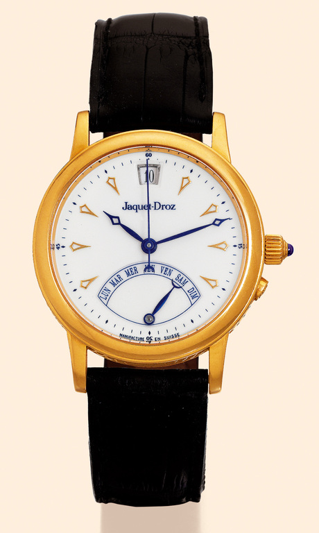 watches : Some Jaquet-Droz watches, pre SWATCH : Jaquet Droz, Swiss, No. 821, Ref. 3255. Made circa 2000. Very fine, self-winding, water-resistant, 18K yellow gold gentleman's wristwatch with center seconds, date and retrograde day of the week sector, 18K yellow gold buckle.1 |