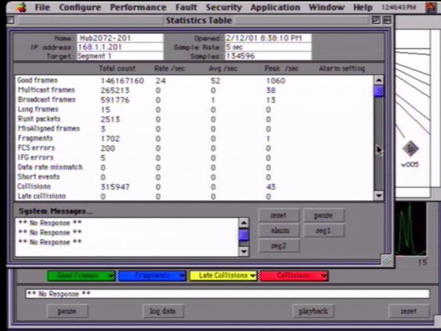 The system is currently 39 active machines, one only does file-server dutied and another only monitors network traffic(see below). That leaves 27 processing machines, of which some double as access terminals or worldly nodes. The entire system is linked together by a massive 10baseT network, supported by four hubs(two Asante 2072's, an Asante personal hub and a Tigerstack24). The two largest hubs also contain SNMP network monitoring hardware which allows network traffic to be monitored on a Macintosh computer. With some creative wiring, the mac(a Quadra 840AV) is sending it's screen image to one of hte Indy's, who is saving the video image as seen below. Alongside the 10T network, all of the Athlons and a growing number of the Pentia are also connected by a 100baseTx network, supported by a 24 port Linksys hub(soon to be illustrated).