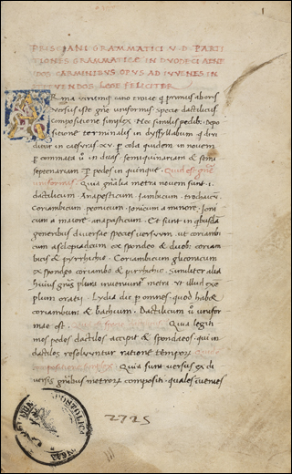 Vat.lat.2725, Donatus,Marius Victorinus,Petronius Arbitrus,Priscianus,Priscianus,Renus Savinus,Rufinus Anthiocensis,Valerius Probus De barbarismo, solceismo, et schematico,De duodecim primis Encidorum (?) carminibus partitiones Grammaticae,De numeris et ponderibus. ad Simachum,De ponderibus et mensuris in versu,Ex Petronio Arbitro collecta,Grammatices commentarium in Metra Terentiana,M
