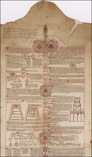 Only twelve manuscripts were digitized this week. See all the details at MacroTypography. With the exception of Ross,2, a Confessions of Bernardino of Sienna, all the manuscripts are part of the Vat.lat fond. The clear standout is a elaborate Peter of Poitiers Compendium roll, Vat.lat.3783. This covers the history of the world from creation through the events in the Hebrew Bible, up to the incarnation and ministry of Jesus, all in one easy-to-read diagram! This is the more elaborate of the two well-knowns Vatican examples.
