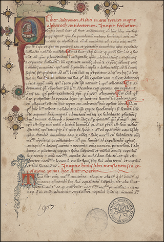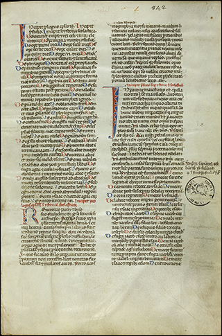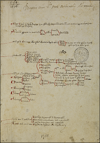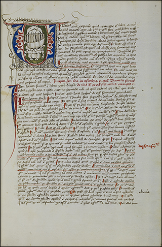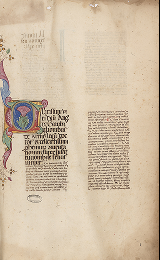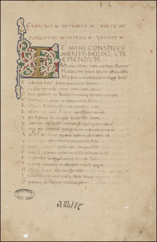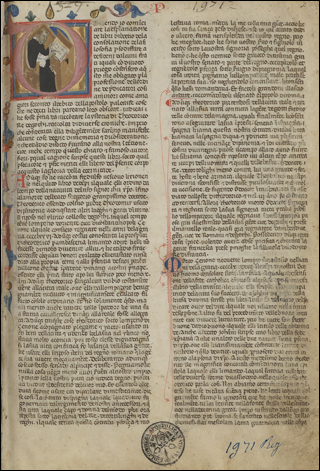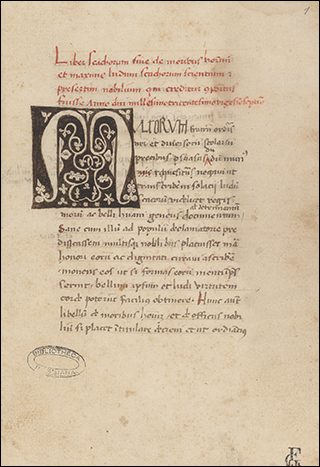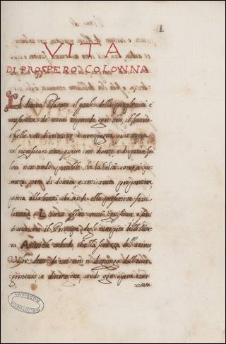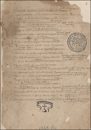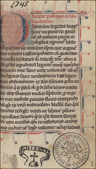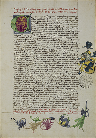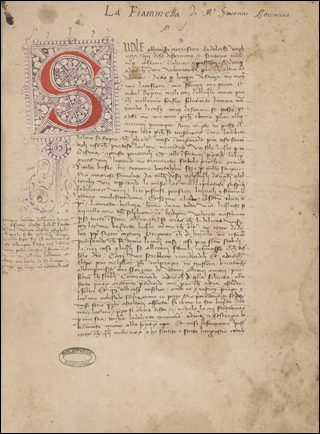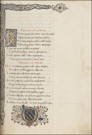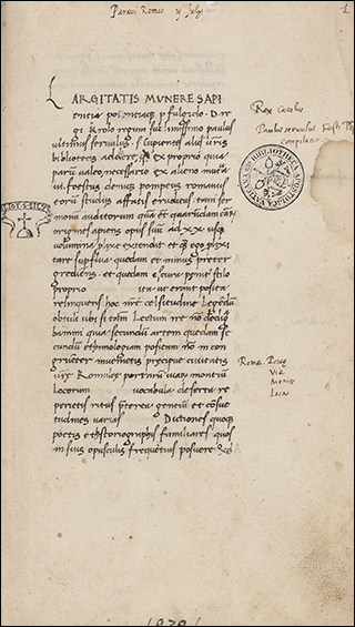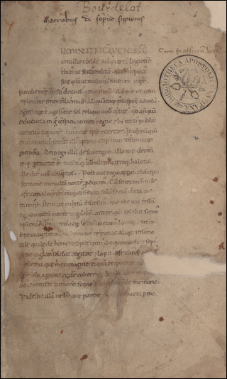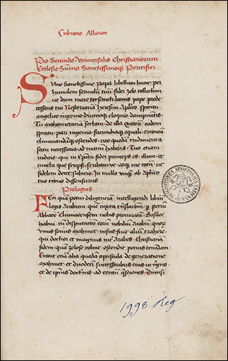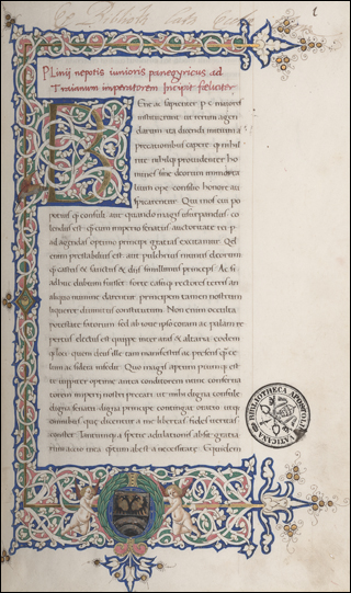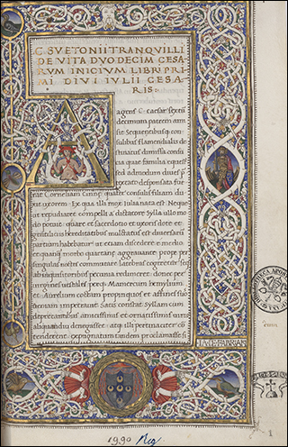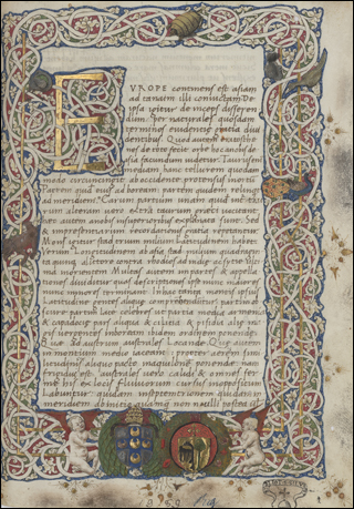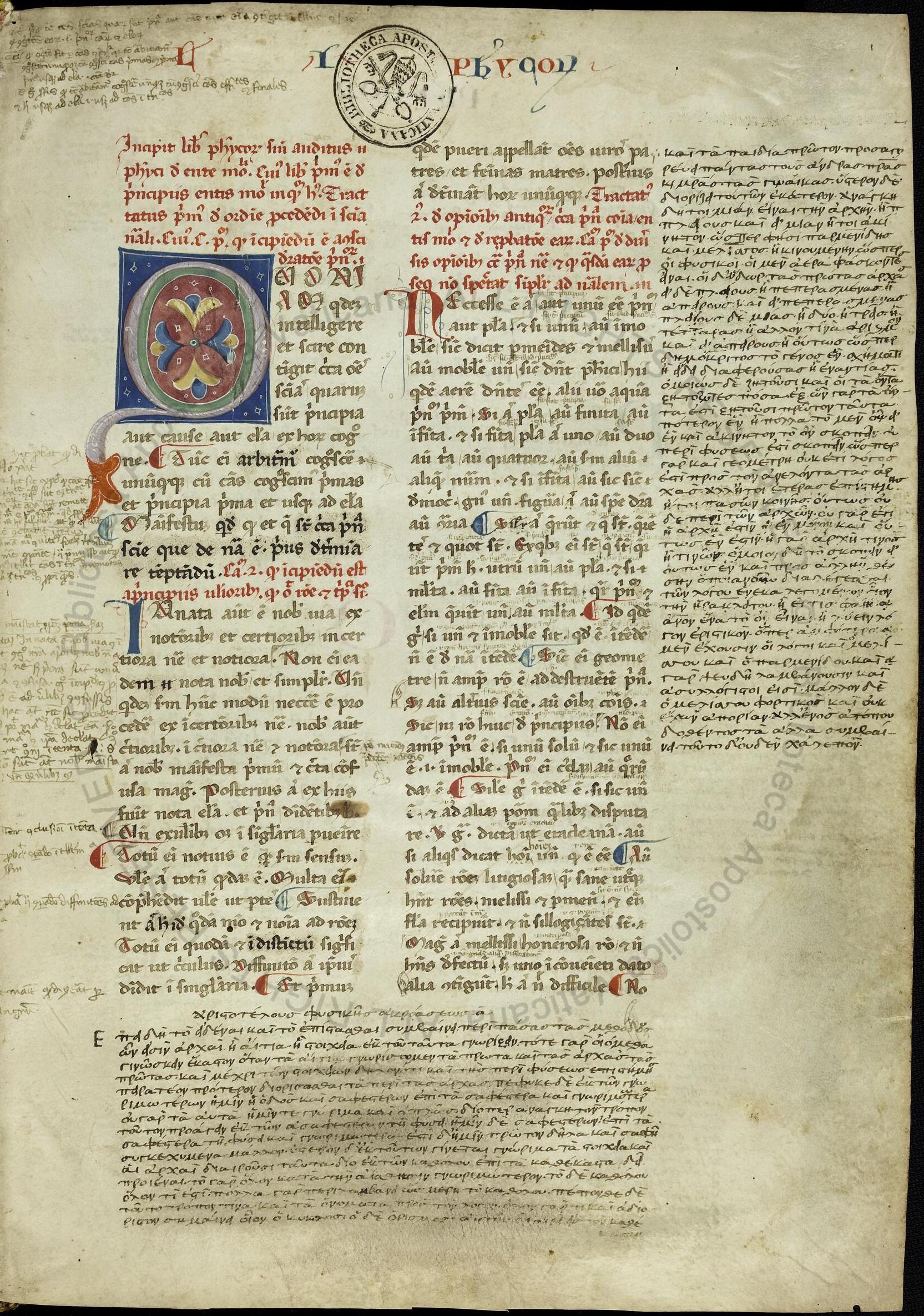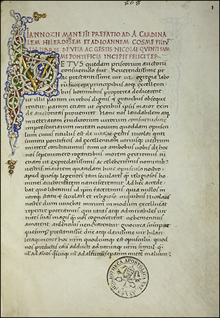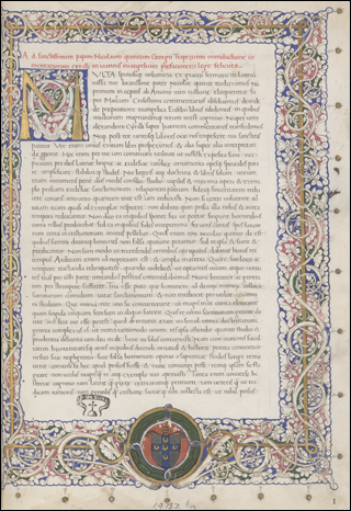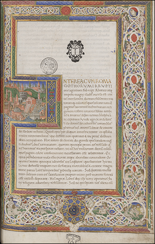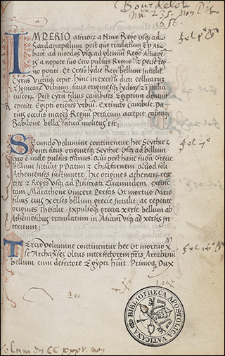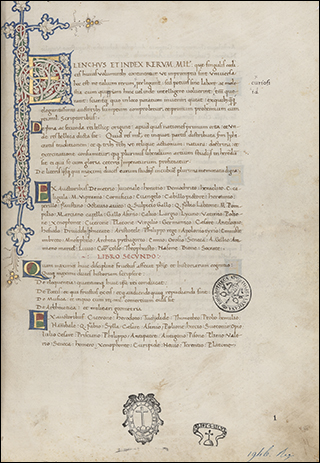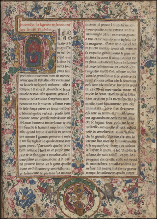 Decoration was completed after the death of the original patron, Pius II's bursar Gilforte Buonconti of Pisa, by Jacopo da Fabriano. The first page of text, between current f.1 (Table of Contents) and f.2 is now in the BM Siena, MS 218, as per handwritten note f.2r/1