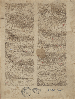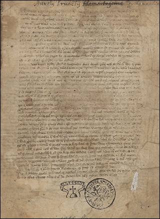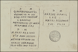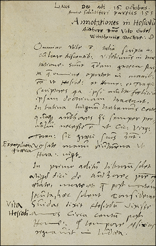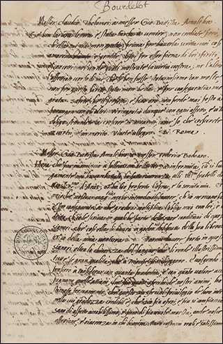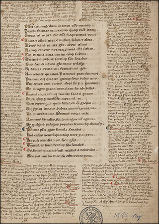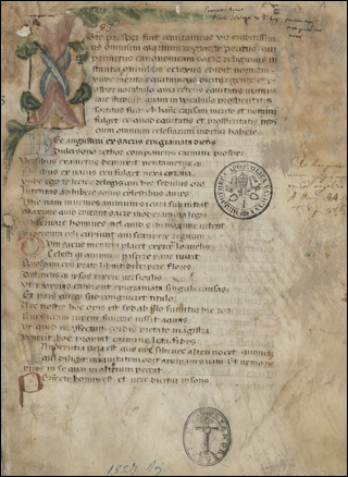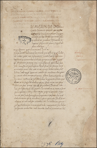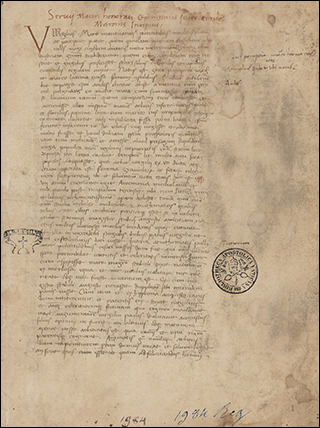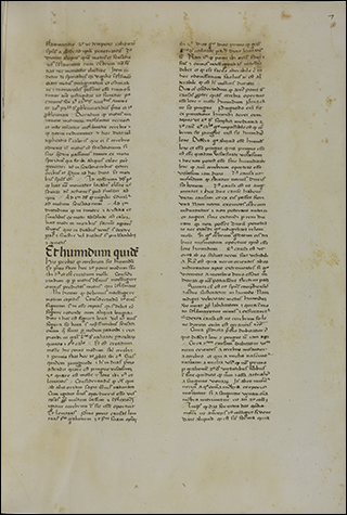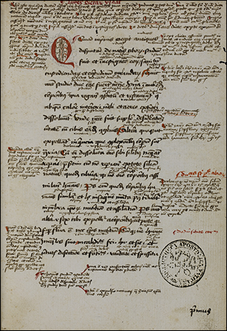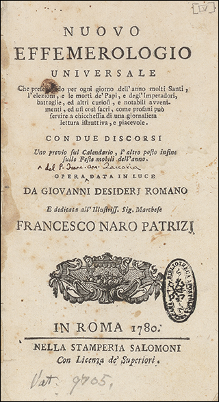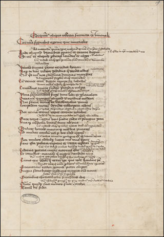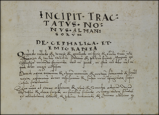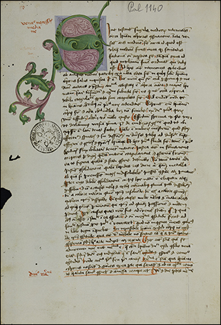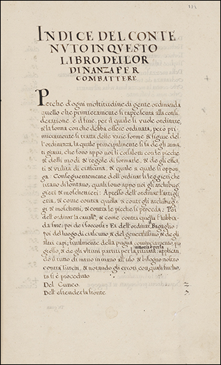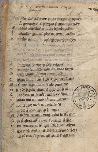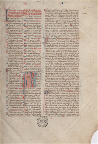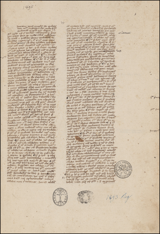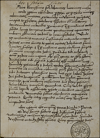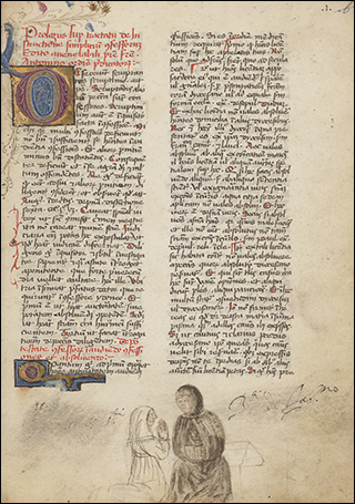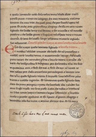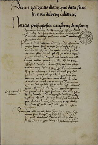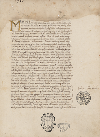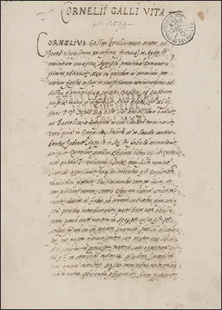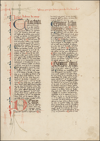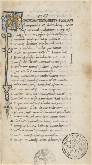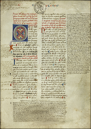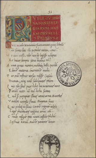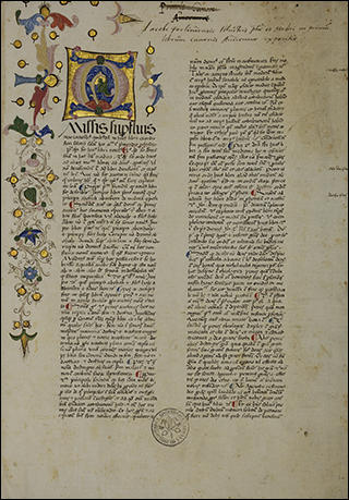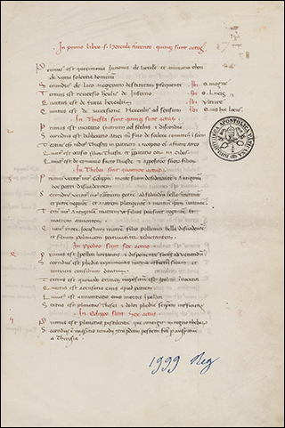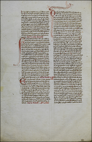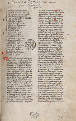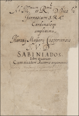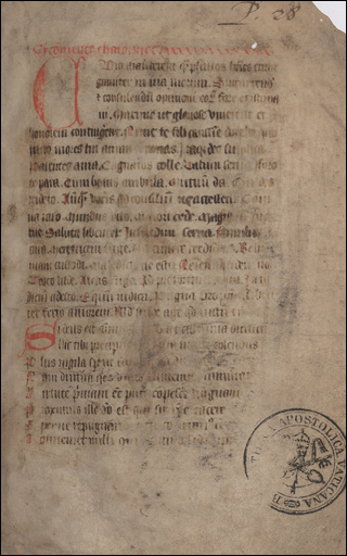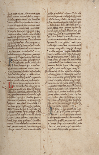 Decoration was completed after the death of the original patron, Pius II's bursar Gilforte Buonconti of Pisa, by Jacopo da Fabriano. The first page of text, between current f.1 (Table of Contents) and f.2 is now in the BM Siena, MS 218, as per handwritten note f.2r/1
