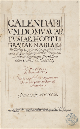 With later additions. Scribe: Joannes Mohr Oberschwarzachensis († March 10, 1632). Contains a page per day with the Saint/Feast of that day and then space for local obituaries. Follows the Carthusian Use
