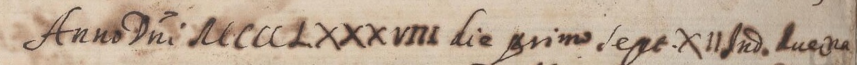 The bottom border is from f.95v of Vat.lat.7145, a 17th C collection of charters and chronicles related to the Kingdom of Naples. This line of text starts the entries for 1388.