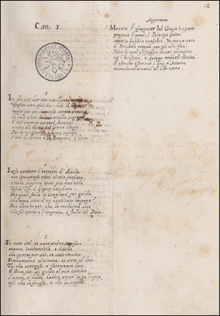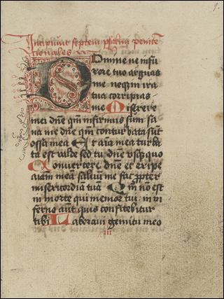 To the right is f.196v from Barb.lat.482, a prayer book from Pesaro made in 1459. It contains a calendar, more in the style of a Book of Hours than a Psalter, and the text of the psalms, Song of Songs, and various hymns and orations. The decorations are extremely elaborate and slightly idiosyncratic. The large miniatures are surrounded with inhabited white vine work, which is not a common pairing of artistic styles. The look is also made unusual by some oxidization of ink , yielding large amounts of gray space in the artwork.