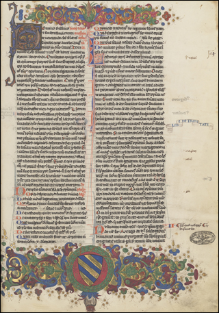 To the right is f.1r from Barb.lat.709, a 14th C copy of several works by St. Augustine(of Hippo, not any of the other Saints Augustine of whom there are several). This is, per the small rubric crunched up at the right hand side of the left column, De Trinitate. This page is interesting visually because the text, the large illuminated initial D, and even the puzzlework L in the right column are all part of a 14th C manuscript. The elaborate decorative bands at top and bottom, including the arms of the House of Montefeltro, however, we added sometime in the 15th C.