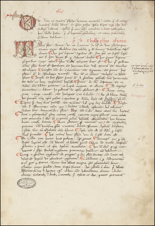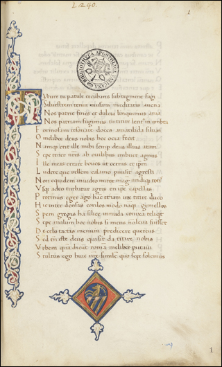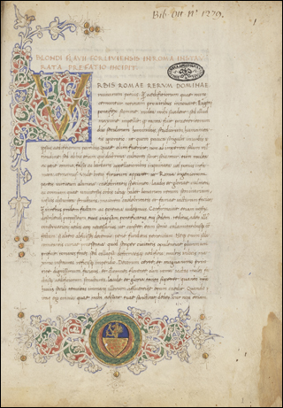 At the bottom is the scribal note at the very end of Ott.lat.1312, which is on f.18v for this short containing a letter from Reniero Fioravante to the Doge, Leonardo Loredan. Although he It is unknown today, a later ownership note on the front flyleaf identifies him as a famous jurist from the time of the League of Cambrai, and his arms are identified on a printed Antiphonal, now in the Archivio Storico Patriarcato of Venice (see Armstrong, Benedetto Bordon and the Illumination of Venetian Choir Books around 1500: Patronage, Production, Competition). It is not uncommon to see a short "thanksgiving" message from the scribe at the end of a work, celebrating the successful completion of the task. This one is brief, and in the same lovely purple ink that was used in the rubric on f.1r.