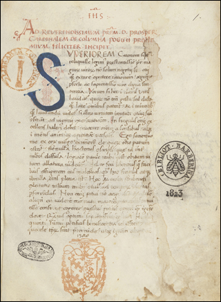 Incipit: Ad reverendissimvm prem. d. prosper Cardinalem de Colvmna Poggii prohe-mivm feliciter incipit. Svperiorem Catonem
