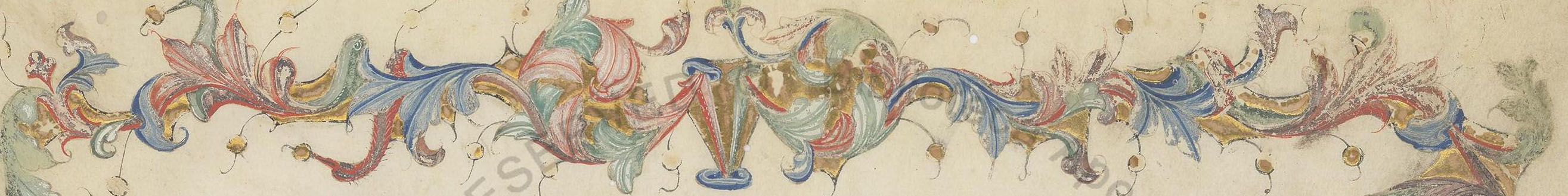 At the bottom is a bit of the border from f.1r of Ott.lat.1884, a manuscript of Petrarch's De remediis utrusque fortune. This particular copy has had what was probably a lovely illuminated letter "C" cut out from the start of the text on this page, though it has been patched and a repair attempted on the text.