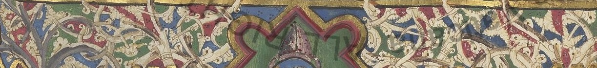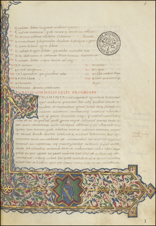 At the bottom is a fragment of the border decorations on f.1r of Ott.lat.1553. This is a manuscript of Cornelius Celsus' De Medicina, a 1st century medical work that was probably part of a larger encyclopedia. Due to a colophon on f.192r, this manuscript can be dated to 1458, in Venice.