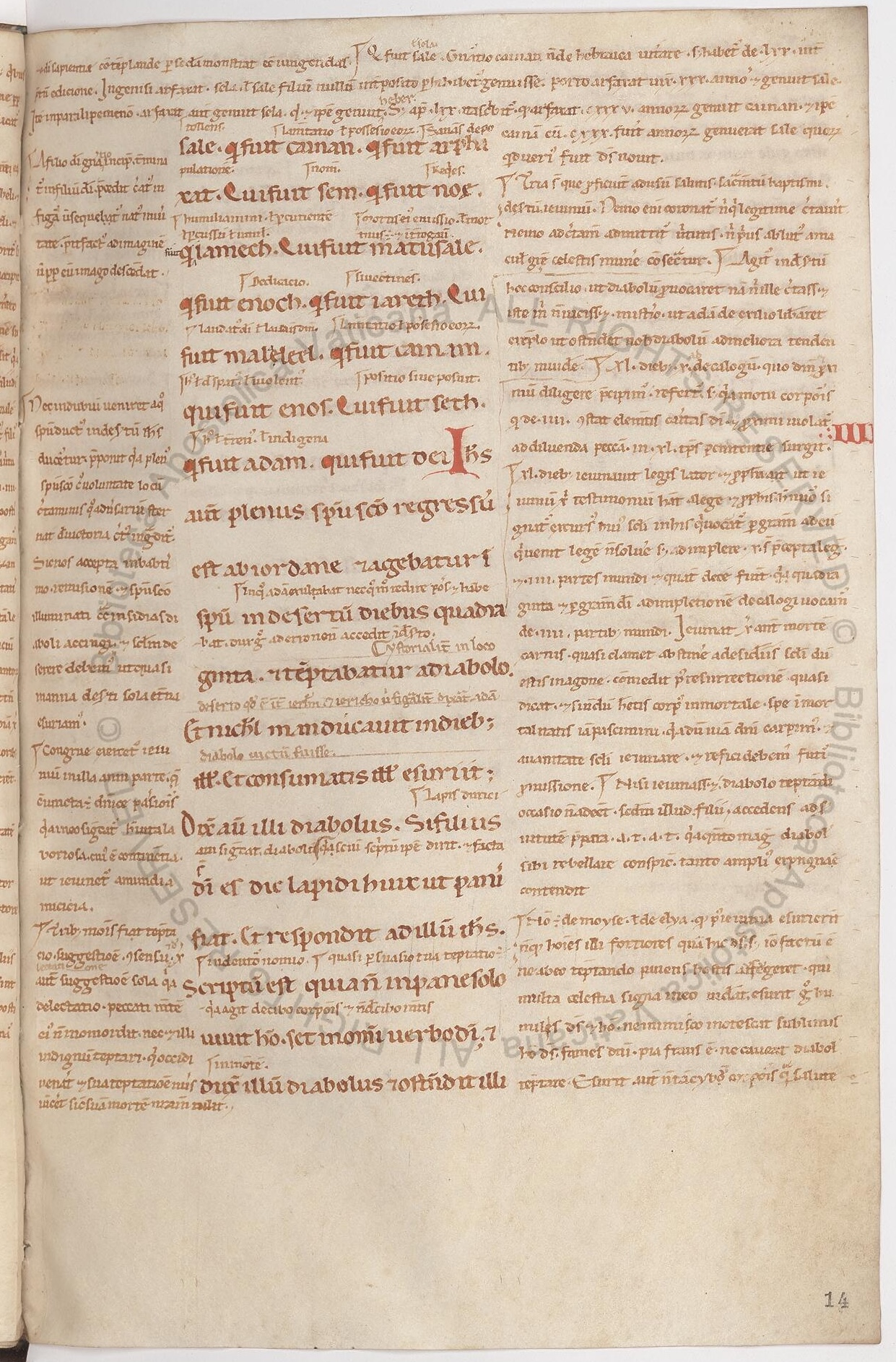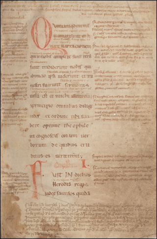 To the right is f.14r from Vat.lat.10680, the previously mentioned 12th c glossed Gospel of Luke. This page has the start of the third chapter, note the III in the margin, about 1/3 of the way down the page. The center column has the main text in the larger letters, with the interlinear gloss of Anselm of Laon in a smaller hand between the lines. On either side is the Glossa Ordinaria, once attributed to Walafrid Strabo, but thought to be by Anselm and his school as well.
