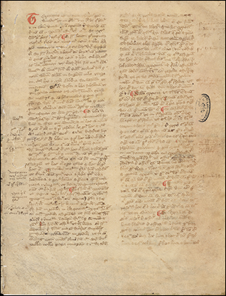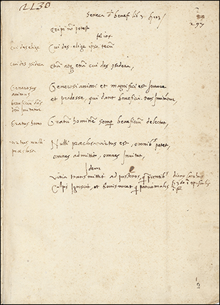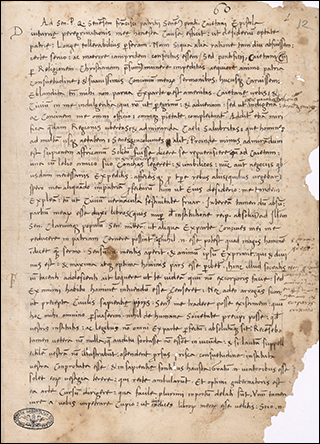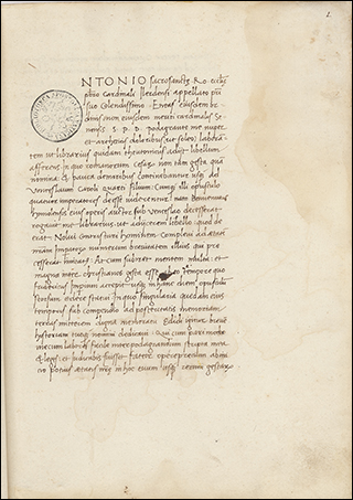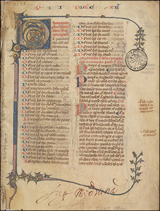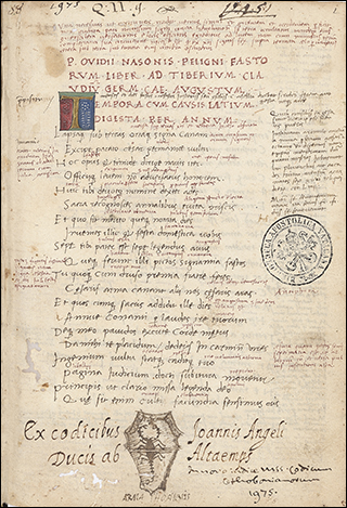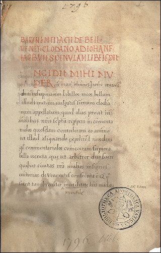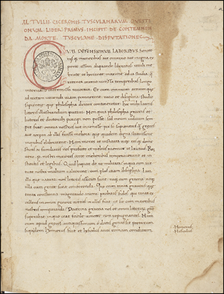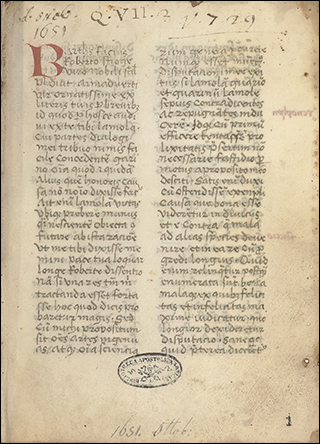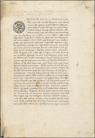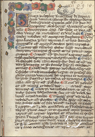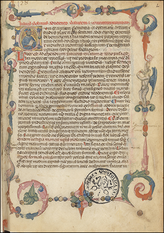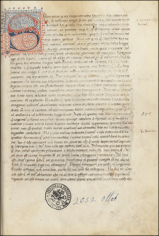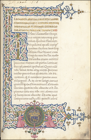 To the right is f.3v from Ott.lat.1646, a distinctively humanist copy of Leonardo Bruni's translation of Plutarch's Vita Marci Antonii. Although not a large book, at 18x10cm, the illuminated initials that start sections, as seen here, are massive. These gold letters on blue, with white vine work, nearly fill the page, only leaving a few lines for a rubric and the start of the section.