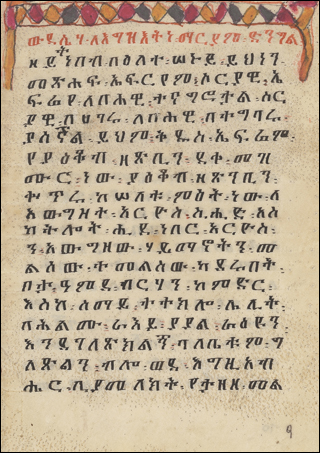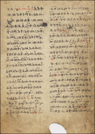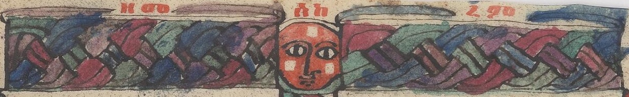 To the right is p.7 from Comb.F.6, a 19th C Mashafa Sa'atat(pdf). This is translated as Book of Hours, but is more like a Breviary, the liturgy of the Hours for a Monastic or other institutional use, written in the Ethiopian liturgical language Ge'ez. This manuscript is unusual among the Comboniani manuscripts that have been digitized for including musical notation, the small dots and Ethiopic letters written interlinearly.