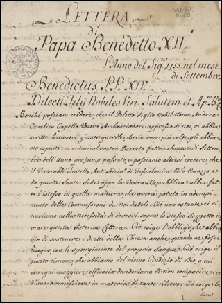 Includes Papal briefs of Clement XII, Innocent XIII and Alexander VII