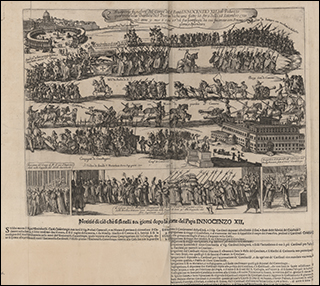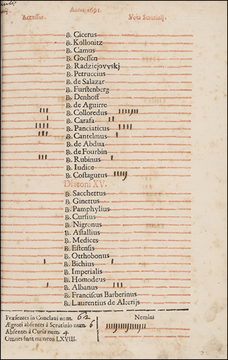 Printed forms with hand written vote counts. This records the 35 rounds of voting that eventually elected Giulio Rospigliosi as Pope Clement IX on June 20, 1667