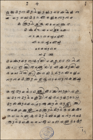 Written in Garshuni Malayalam, the script of the St. Thomas Christians of the Malabar Coast, see Perczel, I. (n.d.). "Garshuni Malayalam: A Witness to an Early Stage of Indian Christian Literature". Hugoye: Journal of Syriac Studies, Vol. 17.2: 263-323. Retrieved August 4, 2020, from https://www.academia.edu/8456992/Garshuni_Malayalam_A_Witness_to_an_Early_Stage_of_Indian_Christian_Literature.