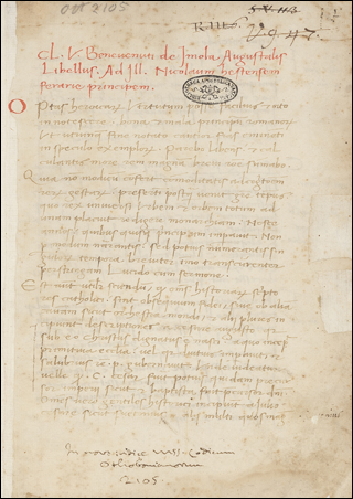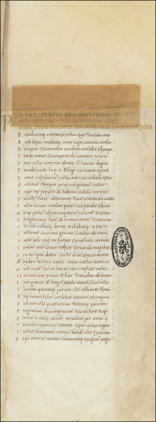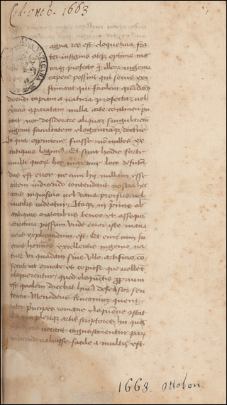 f. 1-26v. Baldasar Rasinus, oration on Franc. Sfortia held at Pavia. Blank pages. 38-43v. Ruglerius Comes, oration (Pavia, 1461). 43v-47. Franc. Philelphus, oration held in Mantua. 48-52. Joh. de Rabestein, oration to Pius II. 52-54v. Anon. oration held in Pavia for Petr. de Nymbis (1463). 54v-63v. Lancelotus Decius, oration (Pavia, 1462). 63v-67. Anon. oration on Leonellus Estensis, inc. Si ullo tempore datum est. 67-68v. Anon. (Guarinus), oration to the same (1433), inc. Hodierno die mi rex. 68v-69. Anon., letter and poem to the same, inc. Non desino Leonelle princeps. 69-72. Oration, inc. Si ullum unquam tempus. 72-81. Pius II, oration held in Mantua. 81-81v. Christ. Maurus, Doge of Venice, letter to Franc. Sfortia. 82. Baltazar (Rasinus), oration held by Galeatius Sfortia in Venice. 82v-84. Catho (Saccus), oration to King Rene. Blank pages. 85. Anon. wedding speech, inc. Qui morem hunc restituere. 85v-86. Short speech by Aeschines, inc. Reminiscor Athenienses. 86-90v. Oration held for Genoa to Franc. Sfortia, inc. Diuturnum dux potentissime. 90v-103v. Anon. oration on Jo. Galeatius Vicecomes, inc. Etsi peccatum michi. 103v-104v. Gasparinus Barzizza, oration to Alexander V. 104v-106v. Id., oration to Fernandus of Aragon. 106-110. Id., other orations. 110-113v. Jo. Jac. Canis, oration. Blank pages. 114-116. Jo. Aloysius Tuscanus, poem to Pius II. 118v-127v. Oratio ambasiatoris regis Francorum, inc. Maximum et amplissimum onus. 127v-129v. Jo. Joffridus, oration held in Mantua (1459). 130-133v. Anon. oration, inc. Sacrosancte Romane sedis auctoritas. 133v-135v. Pius II, bull. 136-139v (other hand). Matheolus Perusinus, oration to Frederick III (1468).