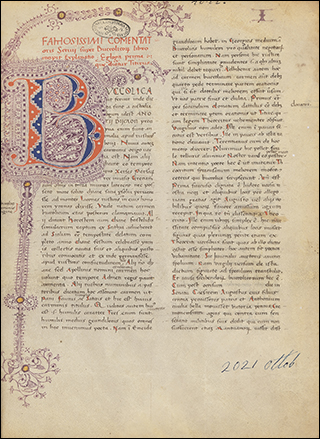 CLA# 1.67, Script: Uncial Written in South or Central Italy. Was probably at Monte Cassino at least as early as the tenth century when parts (now in the O Script is a rather awkward large uncial of the later period: the bow of A occasionally has the pendant form; B has a pro