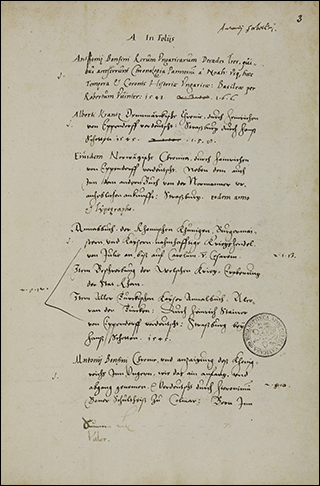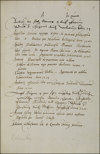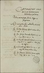 Codices Palatini Entry, Katalog der Privatbibliothek Friedrichs IV.1589, , See Bannister, H. M. Monumenti vaticani di paleografia musicale latina ID# 634[ Title: Antiphonarium, Folio: copertina, Century: 16, Source: tedesco, Notation: linea o rigo]