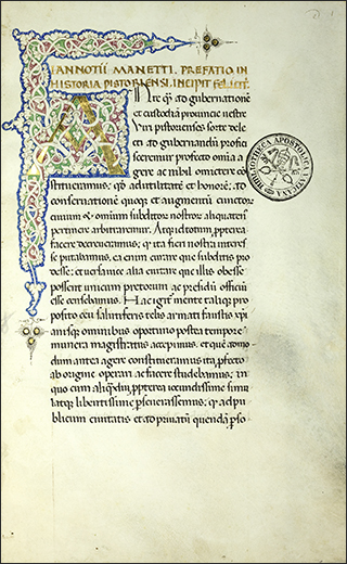 Codices Palatini Entry, Giannozzo Manetti; Neues Testamentwohl Rom oder Neapel; zwischen 1455 und 1457 bzw. 1452 bis 1459