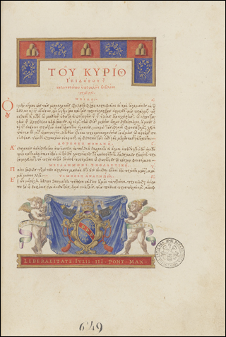 Pinakes Entry, scribes: Bartolomeo Zanetti (ff. 175-303), Ἀνδρόνικος Νούκκιος (ff. 1-93, 97-144v), Βασίλειος Βαλερίς (ff. 93-96v, 145-174v)