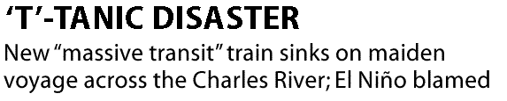 BOSTON The T-Tanic, largest subway train in all history, has foundered on its maiden voyage across the Charles River with great loss of life. Little is known for certain at this time, but reports indicate that the great T train sank after a collision with a large iceberg.